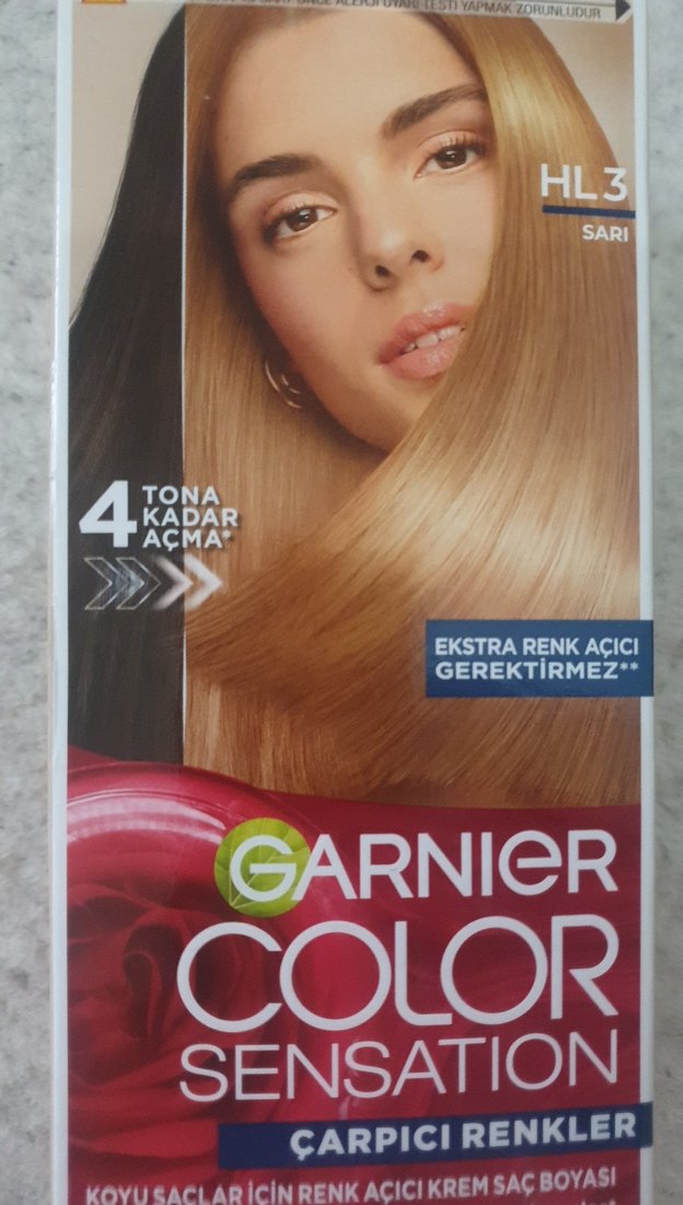 Garnier Color Sensation HL3 sarı saç boyası, saçları ekstra renk açıcı gerektirmeden 4 tona kadar açar. sadece nohut tanesi kadar bile değil koyu sacimin bir tutaminda denedim acmadi.