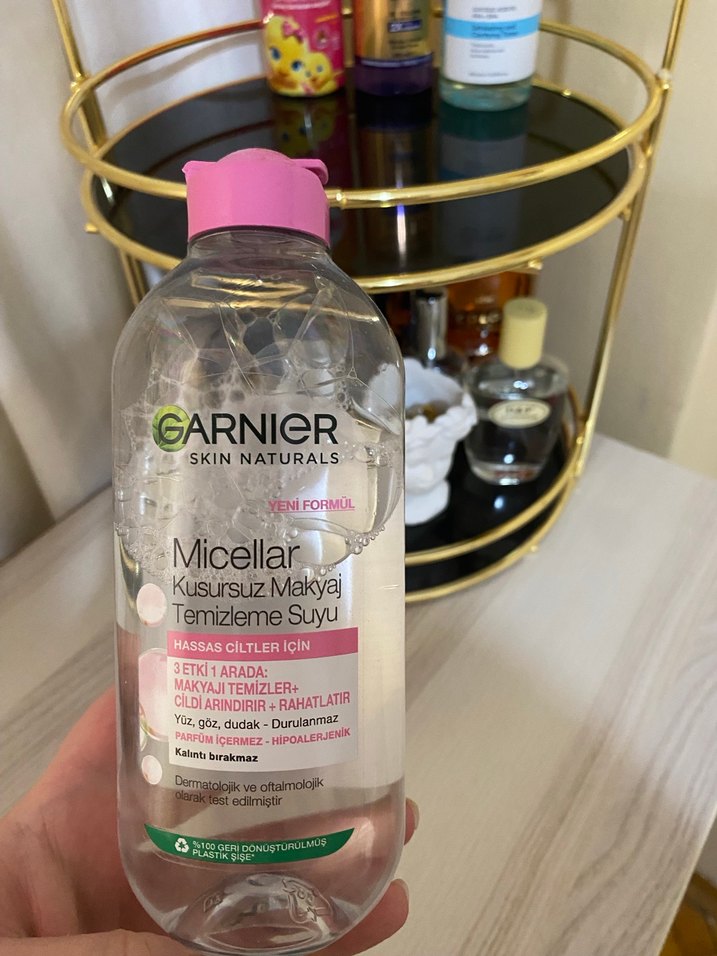 Garnier Micellar Kusursuz Makyaj Temizleme Suyu, hassas ciltler için makyajı ve kiri nazikçe temizler, cildi rahatlatır ve kalıntı bırakmaz.