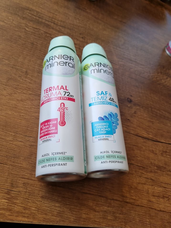 Garnier Mineral kadın deodorantları alkol içermeden anti-perspirant koruma sağlar. Termal Koruma 45°C'ye dayanıklı, Saf & Temiz ise arındırıcı çay ağacı yağı içerir.