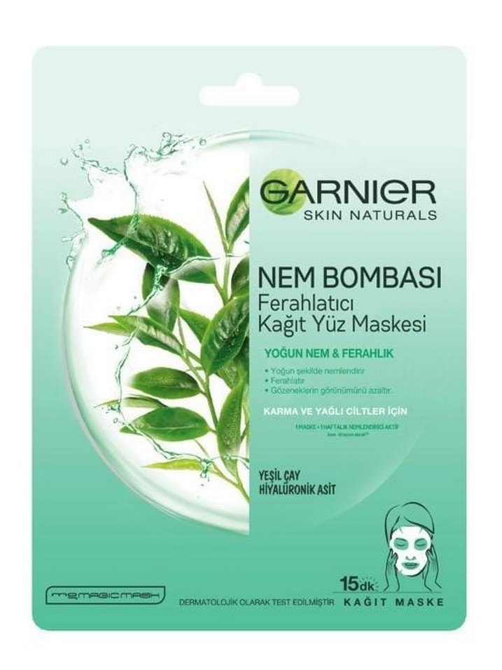 Garnier Skin Naturals Nem Bombası kağıt yüz maskesi, yeşil çay ve hiyalüronik asit içerir. Karma ve yağlı ciltler için yoğun nem ve ferahlık sağlar. 15 dakikada etkilidir.