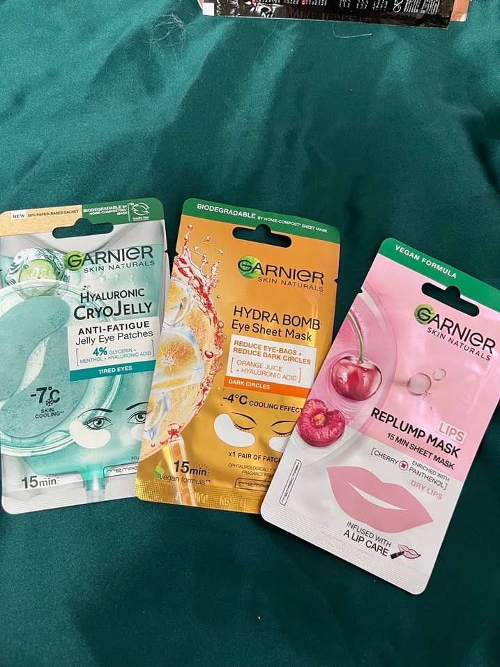 Garnier'in 15 dakikalık kullanıma uygun nemlendirici ve canlandırıcı göz ve dudak maskeleri seti. Anti-yorgunluk jel, hyaluronik asit ve kiraz özlü maskeler içerir.