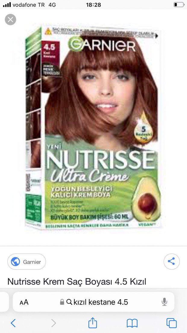 Garnier Nutrisse Ultra Creme 4.5 kızıl saç boyası, yoğun besleyici krem yapısıyla kalıcı renk sağlar. Avokado içeren 60 ml bakım şişesi dahildir. Vegan formül.
