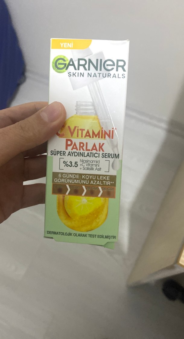 Garnier Skin Naturals vitamin C içeren parlaklık veren serum, 6 günde koyu leke görünümünü azaltır. %3,5 niasinamid, vitamin C ve salisilik asit içerir. Dermatolojik olarak test edilmiştir.