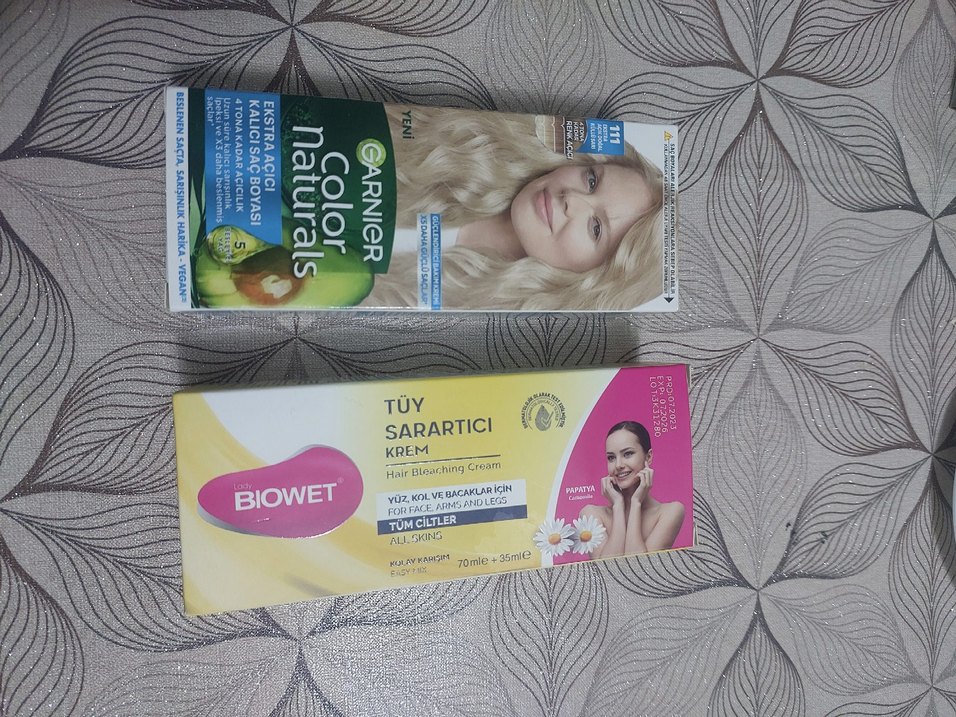 Garnier Color Naturals saç açıcı krem ve Biowet tüy sarartıcı krem, yüz, kol ve bacaklar için tüm cilt tiplerine uygun, saç ve tüy açıcı ürünler içerir. ikisi 300 tl.