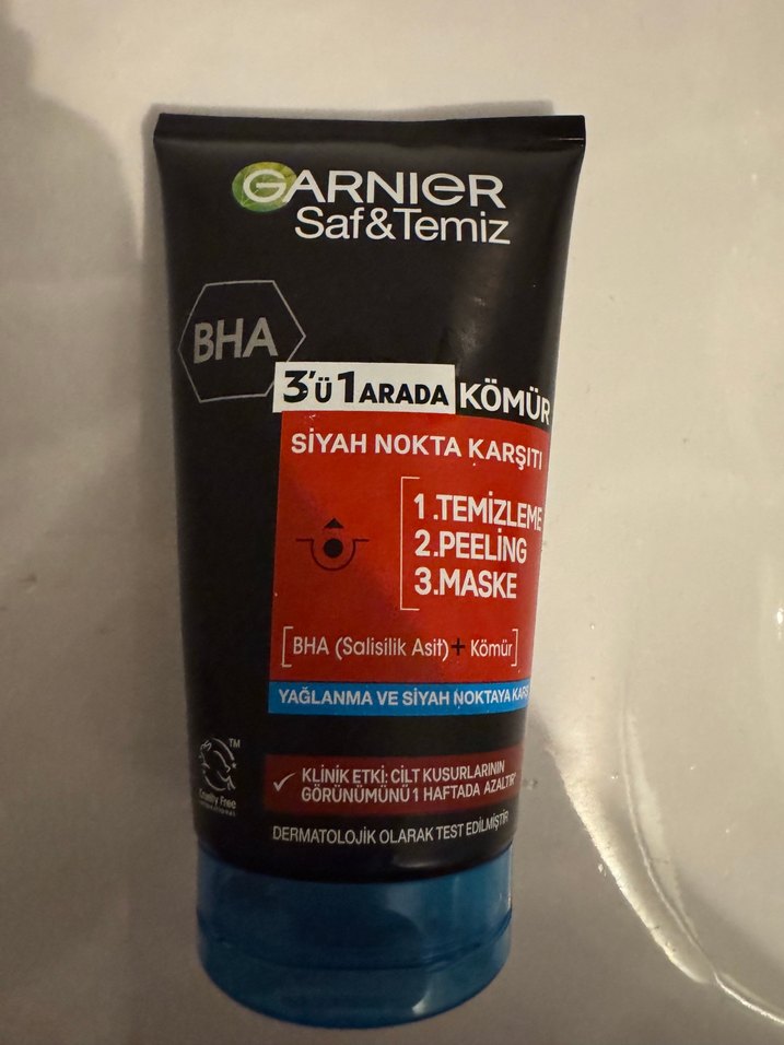 Garnier Saf&Temiz 3'ü 1 arada kömürlü ürün, temizleme, peeling ve maske işlemlerini bir arada sunar. Siyah nokta ve yağlanma karşıtı BHA (salisilik asit) içerir. Klinik olarak test edilmiştir. neredeyse tamamı dolu