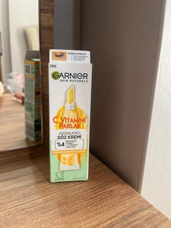 Garnier Skin Naturals C vitamini içeren, yorgunluk ve koyu halkalara karşı aydınlatıcı göz kremi. Açık sarı tonunda.