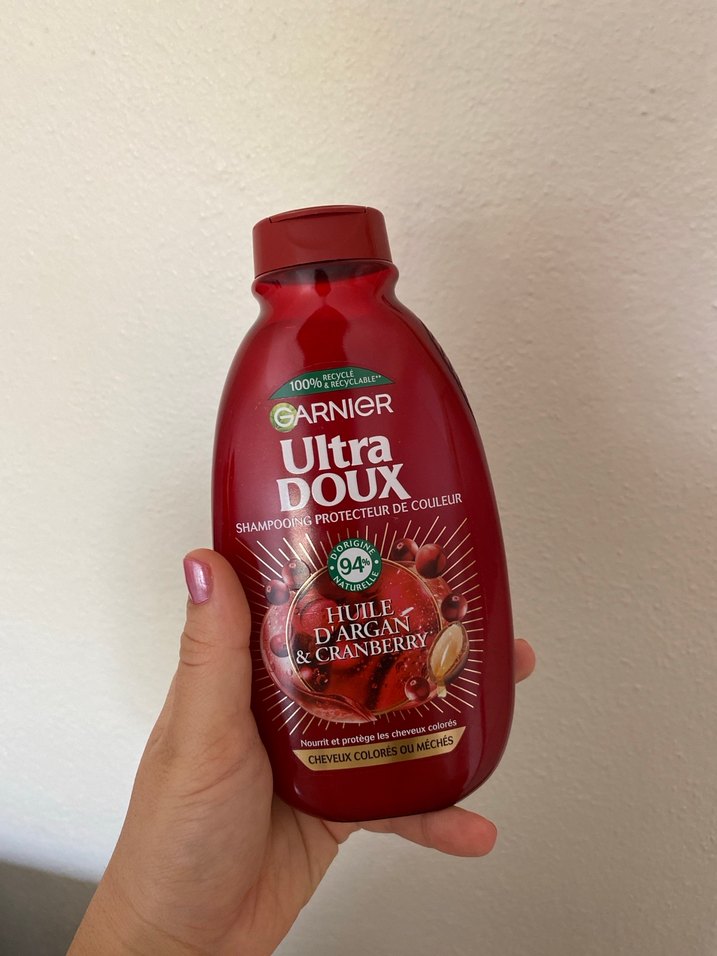 Garnier Ultra Doux argan yağı ve cranberry içeren şampuan, boyalı ve röfleli saçları besler ve korur. %94 doğal içerik içerir. Yurtdışından geldi, hiç kullanılmadı.