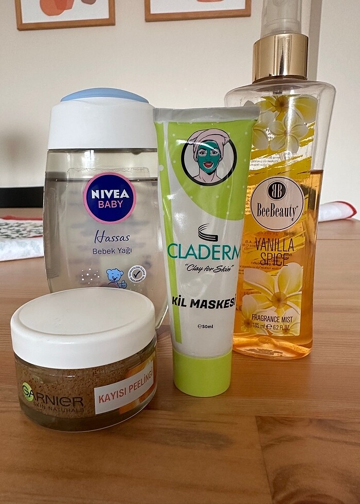 Garnier ve kil maskesi kullanılmadı, açılmadı. Bebe yağı ve deodorant çok az kullanıldı, fotoğraflarda mevcut. Deodorant tatlı, vanilyalı bir koku kurabiye gibi