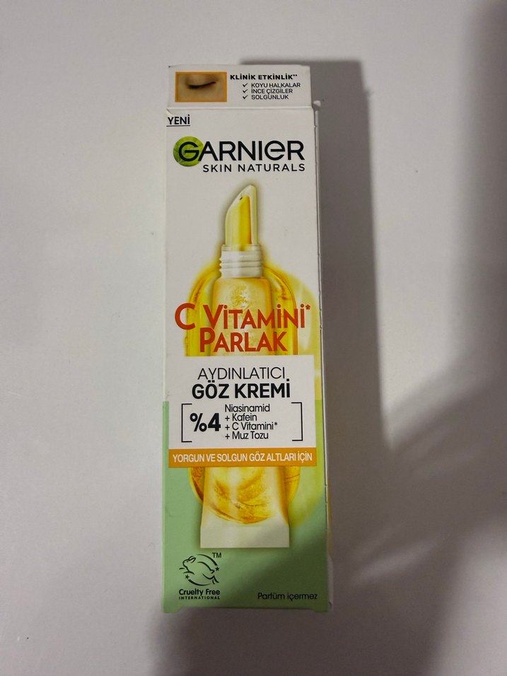 Garni̇er Vitamin C içeren %4 saf vitaminli göz kremi, göz çevresini aydınlatır ve canlandırır. 15 ml tüpte, doğal içeriklerle. 1 kez kullanıldı yeni alındı