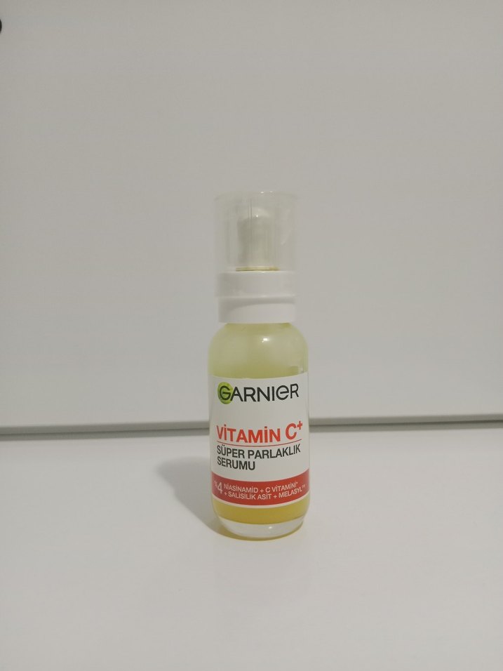 Garnier Vitamin C+ serumu, niasinamid ve C vitamini ile cildi aydınlatır ve canlandırır, süper parlaklık sağlar. 6 aylık kullanım süresi var halâ. Şişenin yarısı duruyor.