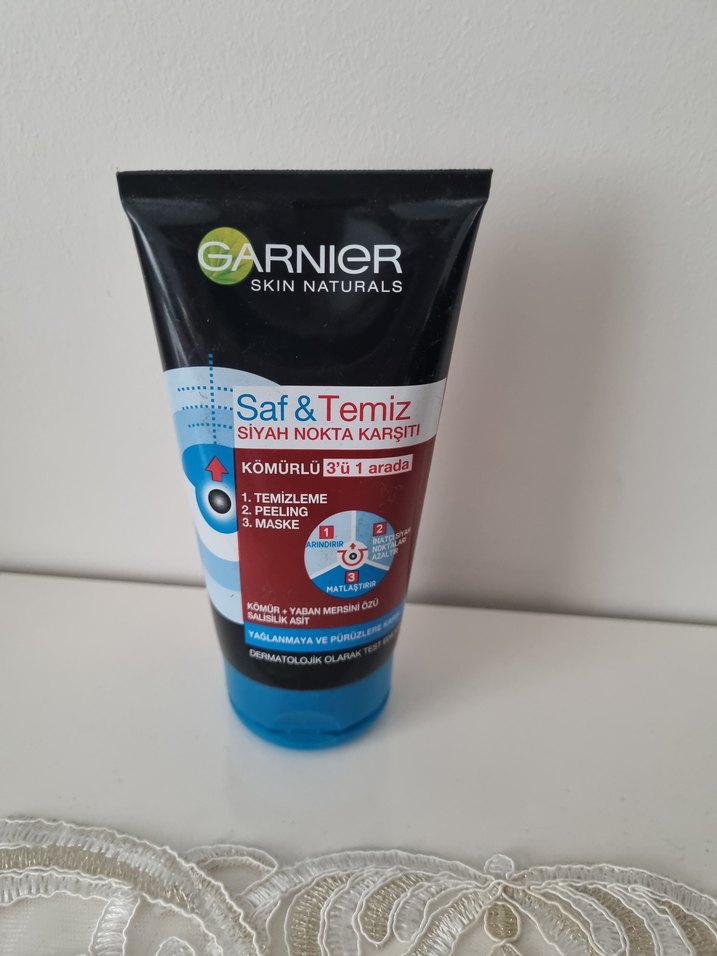 Garnier Skin Naturals Saf & Temiz, kömür, söğüt ve yaban mersini özü ile siyah noktalara karşı 3'ü 1 arada temizlik, peeling ve maske sağlar. Yağlanma ve pürüzleri azaltır. sadece 2 kez kullanıldı