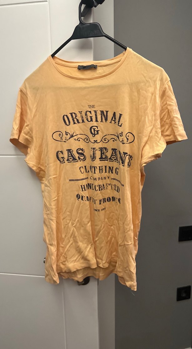 Sarı pamuklu erkek tişörtü, bol kesim ve kısa kolludur. Önünde vintage tarzı baskılı desen bulunur. Yuvarlak yaka ve günlük sokak giyimi için uygundur. # marka # orijinal# gas
