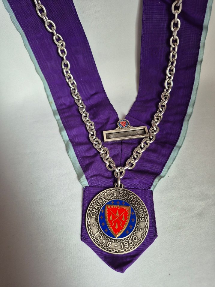 GASTRONOMİ DERNEĞİ ÜYE MADALYASI..Dünyanın en eski ve prestijli gastronomi zinciri olan Confrerie de la Chaine des Rotisseurs'e ait orijinal üye nişanıdır.Amatör Gastronom seviyesi kordonu.Madalya üzerinde 1248 (kuruluş) ve 1950 (yeniden canlanış) tarihleri ile derneğin ikonik amblemi yer almaktadır.