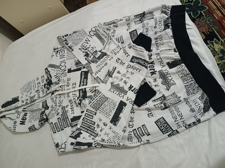 Çeşitli başlıklar ve haberlerin yer aldığı siyah beyaz gazete baskılı sweatshirt