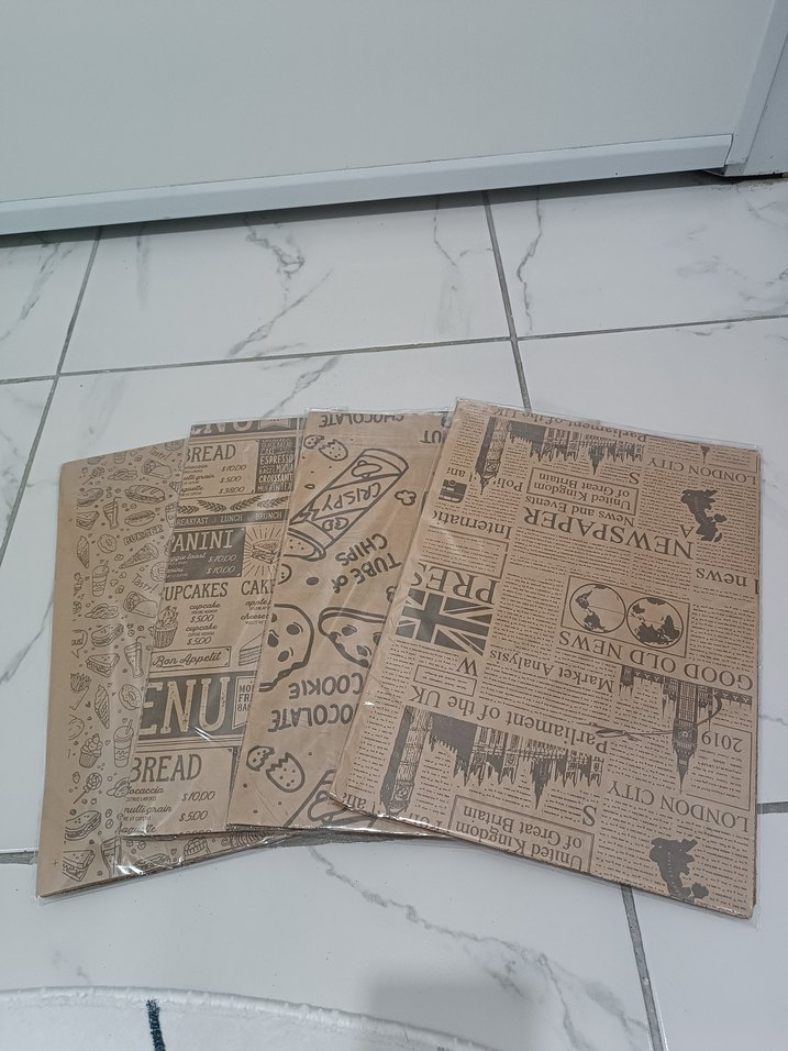Bu set, gri tonlarda gazete ve yiyecek temalı baskılara sahip kahverengi kağıt yaprakları içerir. Üzerinde 'BREAD', 'NOGNO' ve 'MEIN' yazıları bulunur.