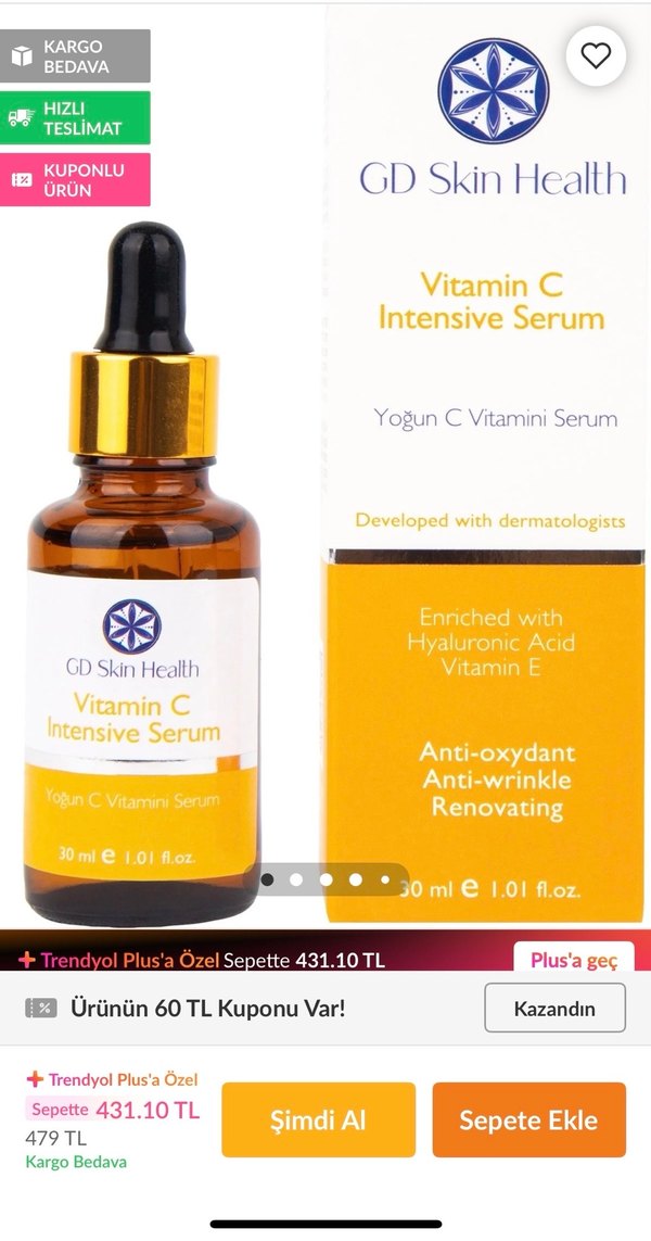 GD Skin Health Yoğun C Vitamini Serumu, hyaluronik asit ve E vitamini ile zenginleştirilmiştir. Antioksidan, kırışıklık karşıtı ve yenileyici özellikler sunar. GD Skin Health markasının orijinal ürünüdür. Çok az kullandım. Kullandığım yeri fotoğrafta çizdim. Son kullanma tarihi Ağustos 2026 fotoğrafda görünüyor. Satış fiyatının yarısına koydum.