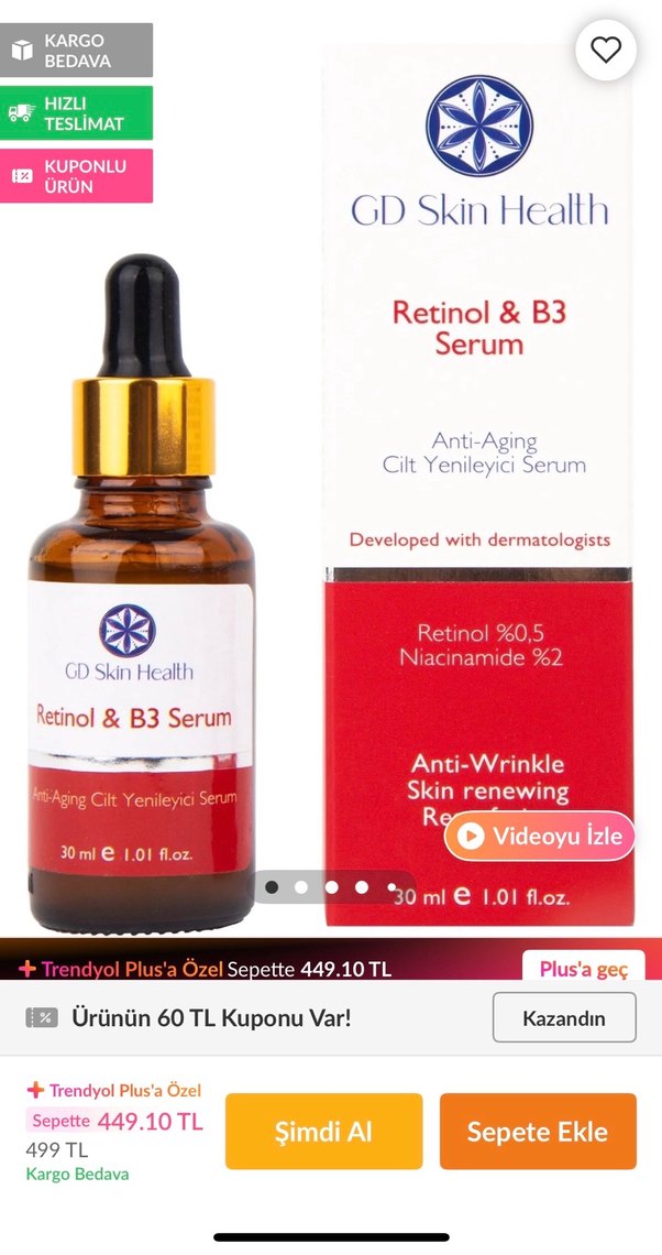 GD Skin Health Retinol & B3 Serum, %0.5 retinol ve %2 niasinamid içerir. Kırışıklıkları azaltmaya ve cildi yenilemeye yardımcıdır. Dermatologlarla geliştirilmiştir. ✨ GD Skin Health markasının orijinal ürünüdür. Çok az kullandım. Kullandığım yeri fotoğrafta çizdim. Son kullanma tarihi Eylül 2026 fotoğrafda görünüyor. Satış fiyatının yarısına koydum.