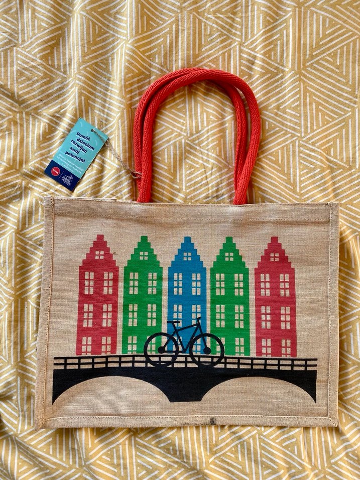 Gdankstan alınmış, büyük boy alışveris çantası. Üstünde şehir simgesi geleneksel evleri ve köprü baskısı vardır. Etiketi üstünde.