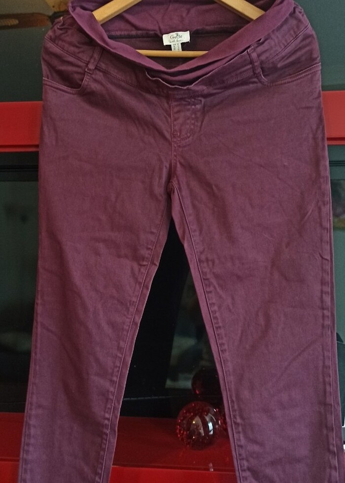 Ürün Gebe marka olup 38 bedene uygundur ,hamile için lastik karın bölgesi bulunmakta , 1 defa giyildi sadece kaldı.hicbir kusuuru yok sıfır ayarında. renk süper bordo/mürdüm gibi. ölçüler karnın lastik kısmı 42 cm ve tabi ki aşırı esnek lastik olduğundan, lastiğin bitip düğme ve fermaurin başladığı kısım ki hamile pantolonlarinda bu basene denk geliyor 45 cm, boy lastik dahil 102 cm, lastik hariç 94 cm