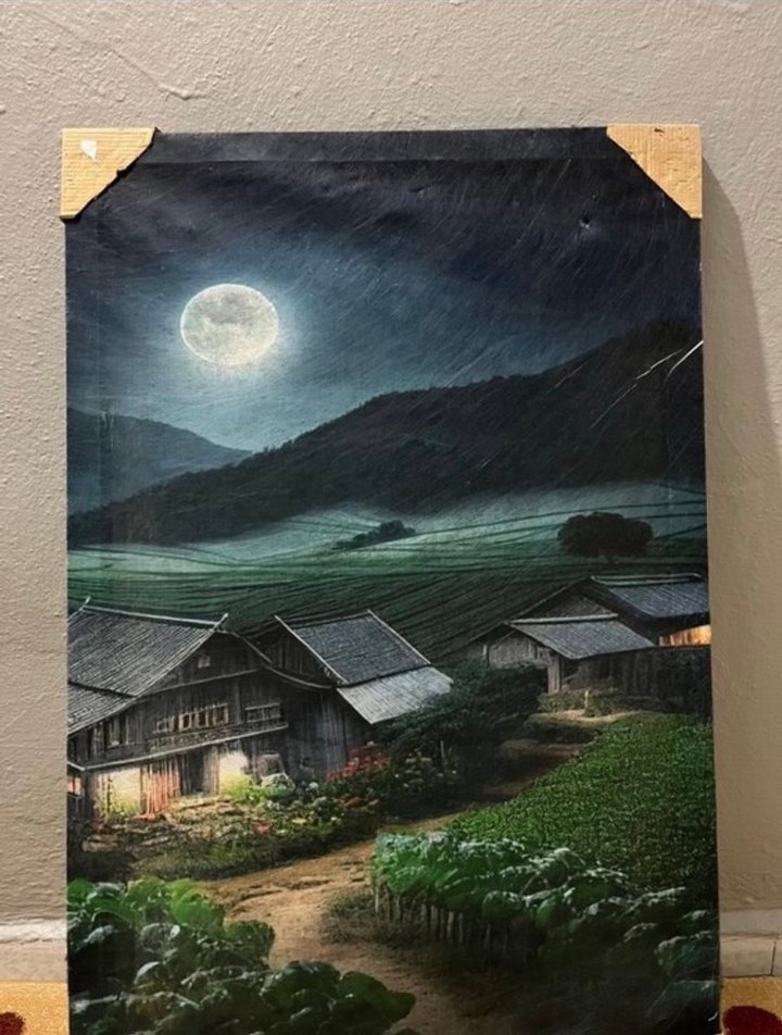 Bu tablo, parlak dolunay altında koyu yeşil köy manzarasını, ahşap evler ve çevresindeki tarlaları gösteriyor.