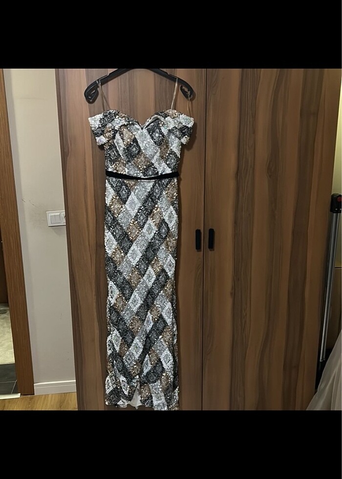 Madonna yaka çok sık bir elbise bir kere giyildi kuru temizleme yapıldı sadece kemer bölümünde arka kısımında kemeri yani ufak sökülmüş iğne iplik halleder full pul payet fakat payetleri çok yumuşak