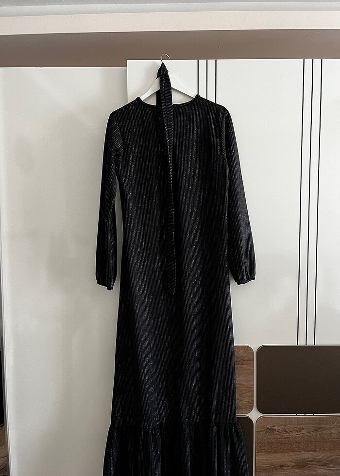 İnanılmaz rahat çok şık siyah elbise çizgiler halinde gümüş sim detayları var .