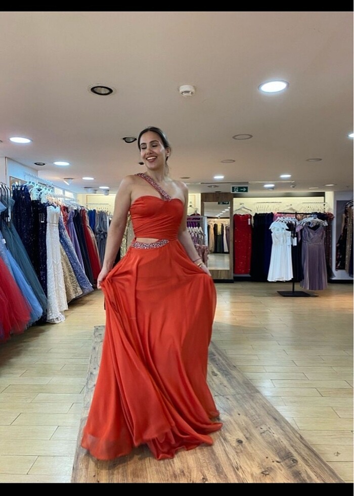 Üst cup tam oturuyor pencere ve yan askı detaylı uçuş uçuş davet elbisesi . Oranj rengi