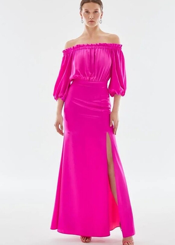 Yırtmacını kısalttım. Bir kere giydim. Boyum 168, kilom 57. S bedenlere olur. Fuşya rengi