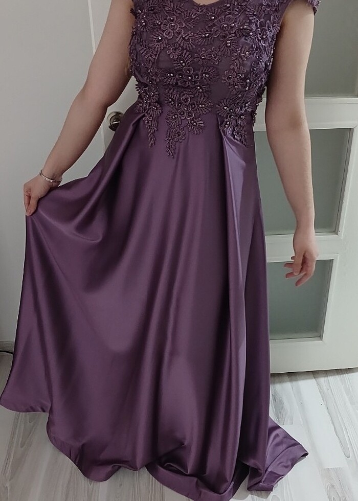 gece elbisesi hiç giyilmedi Sıfır ürün rengi Lila etiketi üzerinde resimde gözüktüğü gibi fermuarında sadece bir sökülme var terzide ya da makineniz varsa kendinizde tamir edebilirsiniz resimde gözüküyor hepsi
