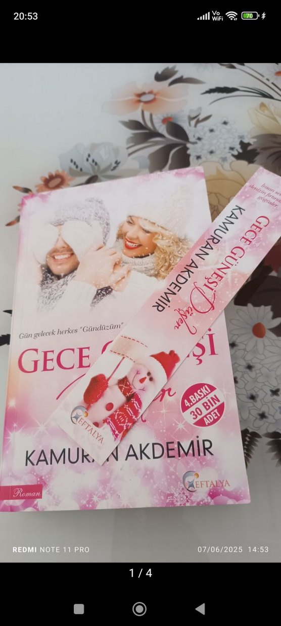 Kamuran Akdemir'in "Gece Güneşi" adlı romanı, kış temalı kapakta sıcak giyimli gülen bir çifti gösteriyor. Karakterli bir ayraç eşlik ediyor.