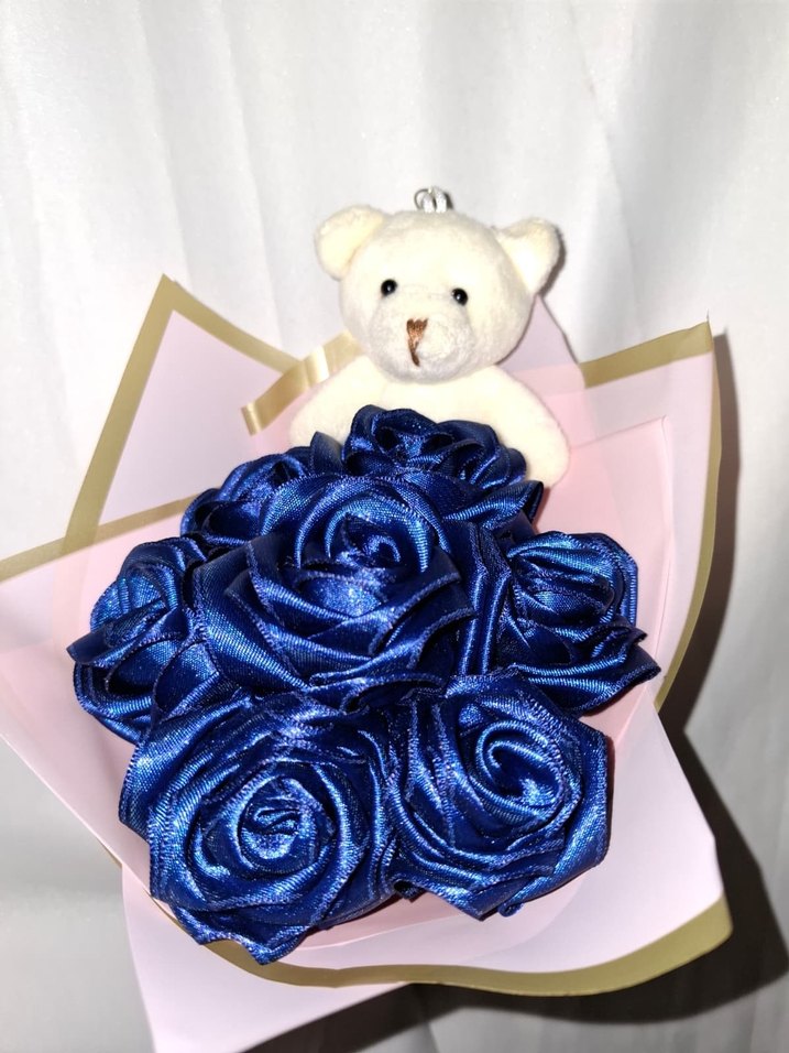 Gece Mavisi Kurdele Çiçek Buketi (Ayıcıklı)