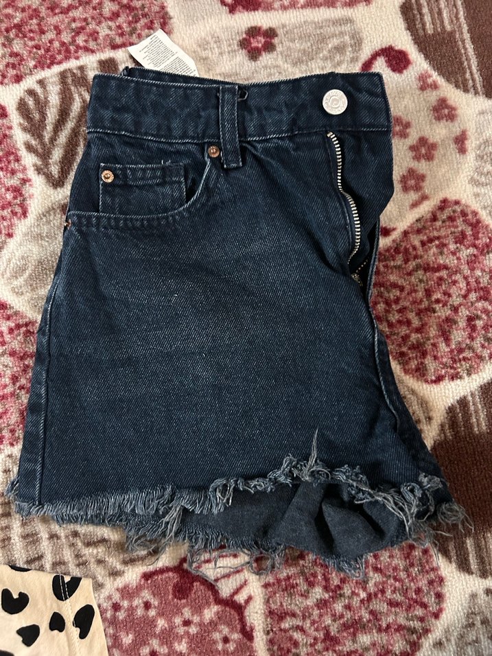Gece mavisi denimden yapılan, bol kesim ve püsküllü kenarlı mini kot şort. Grunge punk tarzına uygun.