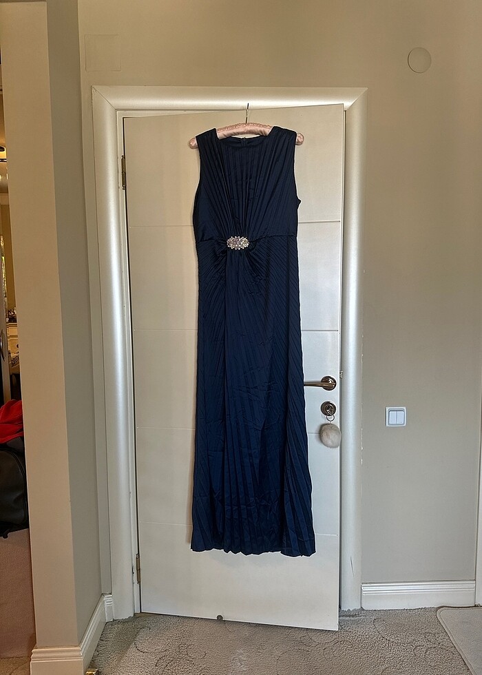Hiç kullanılmamış uzun kolsuz pilili karın ve kalça kusurlarını kapatan çok şık broş detaylı uzun gece elbisesi