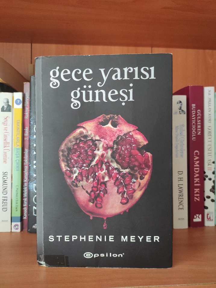 Stephenie Meyer'in "Gece Yarısı Güneşi" adlı romanı, Epsilon yayınevi tarafından basılmıştır ve kapağında dikkat çekici bir nar görseli bulunmaktadır.