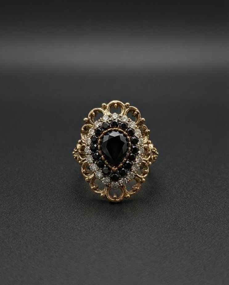 “Zamanın durduğu o loş balo salonunda, sadece hatıraların ışıltısı kalır.” 1920’lerin Pera’sında, ağır kadife perdelerin ardında fısıldanan sırları düşünün... Bu yüzük, sanki o yıllardan kalma mühürlü bir mektubun içinden çıkmış gibi. Merkezindeki damla kesim siyah taş, eski bir hikayenin en derin, en gizemli cümlesini temsil ediyor. Etrafını saran titiz metal işçiliği ise, geçmişin zarafetini bir dantel gibi parmaklarınıza işliyor. #LunabelleRose #VintageYüzük #vintagetakı #antikayüzük #vintage #yüzük #vintagejewelry #vintagering #retroyüzük #bohemyüzük #otantikyüzük