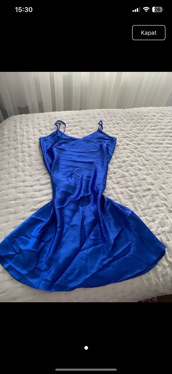 Mavi renkte, drapeli ve ince askılı, v-yaka tasarımlı, normal boy midi elbise. Parlak ve desen içermeyen kumaşıyla romantik akşamlar için uygundur.