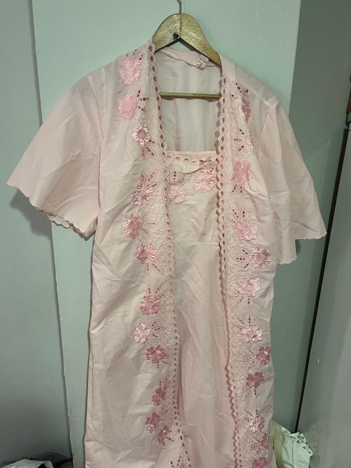 Kısa kollu, işlemeli çiçek detaylarına sahip uzun kadın elbisesi. Regular kesim ve pastel pembe vintage tarzda.sıfır pamuk ürün