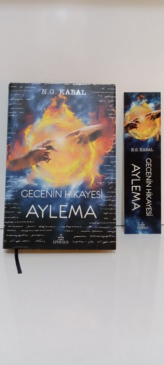 N.G. Kabal'ın 'Gecenin Hikayesi: Aylema' adlı romanı, mistik unsurları simgeleyen alevli bir küreye uzanan iki el görseliyle dikkat çekiyor. Ephesus yayınevi tarafından basılmıştır.