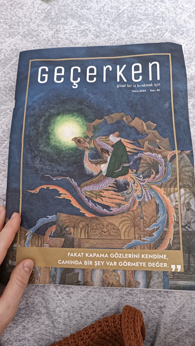 Mayıs 2023 tarihli Geçerken dergisi, sanatsal kapak tasarımı ve zihinde değerli bir şeyi görmek için gözleri kapama üzerine anlamlı bir alıntı içeriyor.