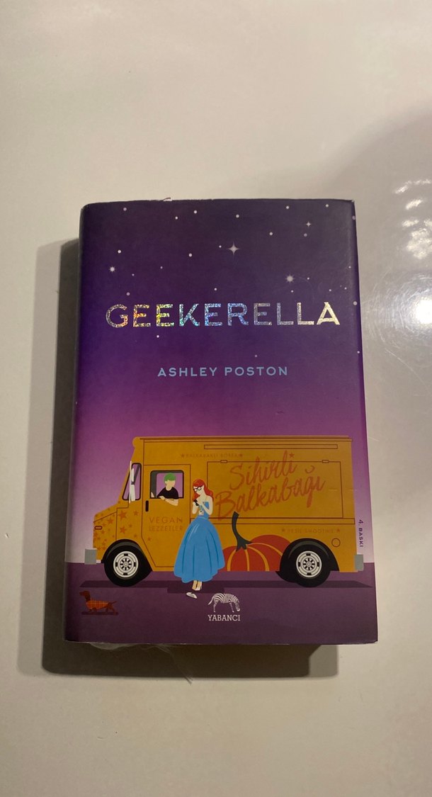 Ashley Poston'un "Geekerella" adlı romanı, yıldızlı gökyüzü altında mavi elbiseli bir karakter ve yiyecek kamyonu görseliyle dikkat çekiyor.