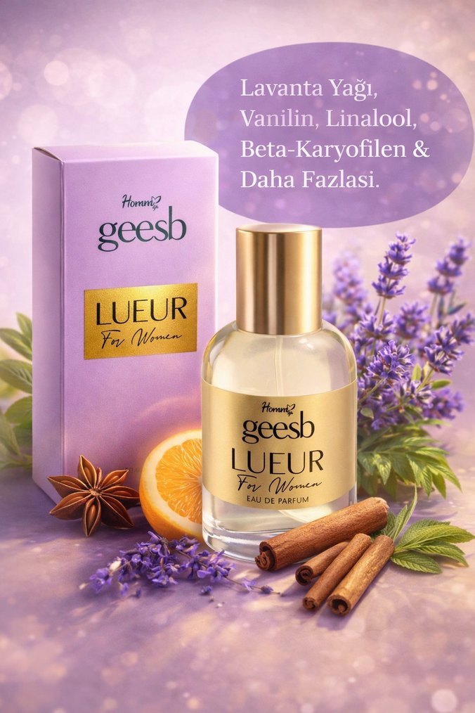 geesb LUEUR Kadın Parfümü lavanta yağı, vanilin, linalool, beta-karyofilen ve diğer notalarla zenginleştirilmiştir.