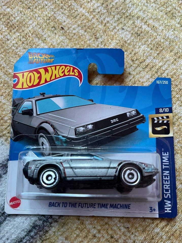 Hot Wheels tarafından üretilen gri DeLorean oyuncak araba, Back to the Future serisine ait ve 8/10 numaralı modeldir. Detaylı tasarıma sahiptir.