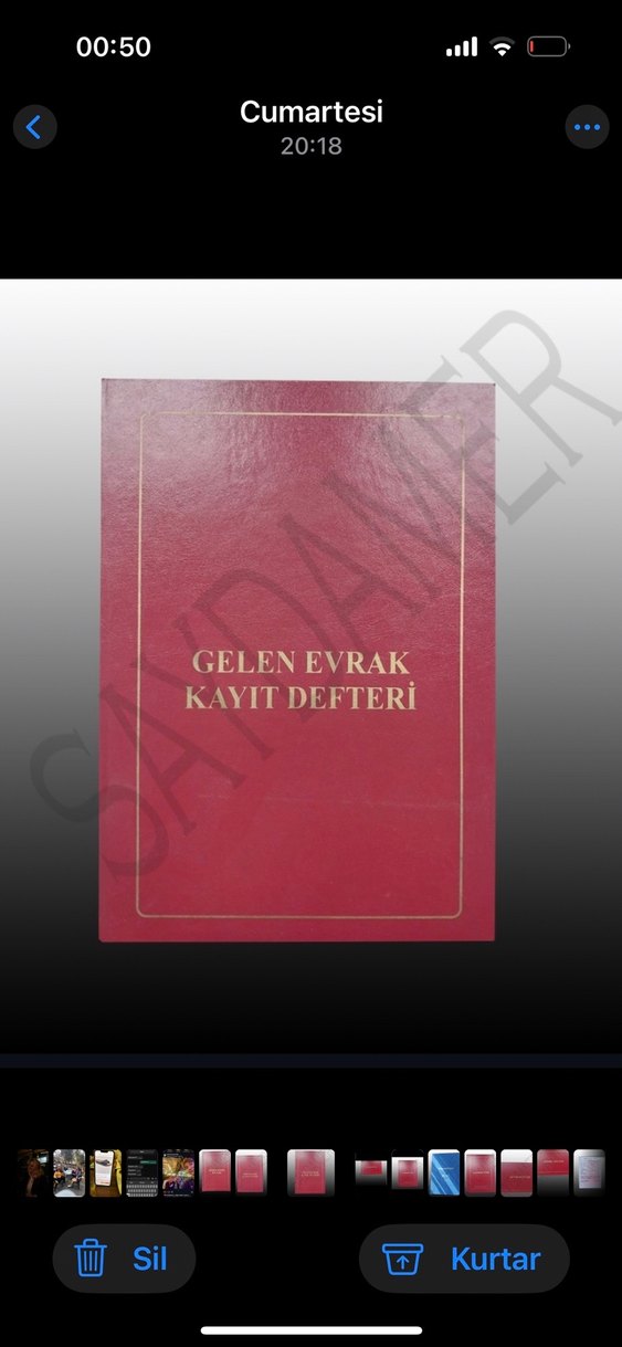 Kırmızı kapaklı, gelen evrakların kaydedildiği 'Gelen Evrak Kayıt Defteri'.