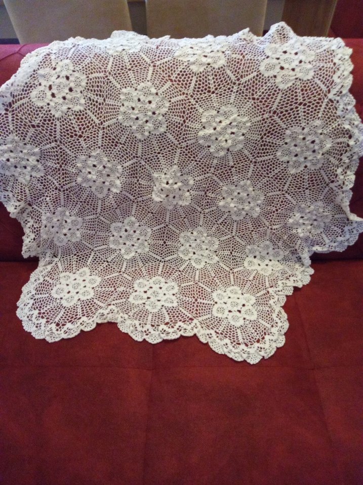 Çiçek desenli, kenarları dalgalı geleneksel beyaz örgü dantel örtü. Fiskos masa örtüsü