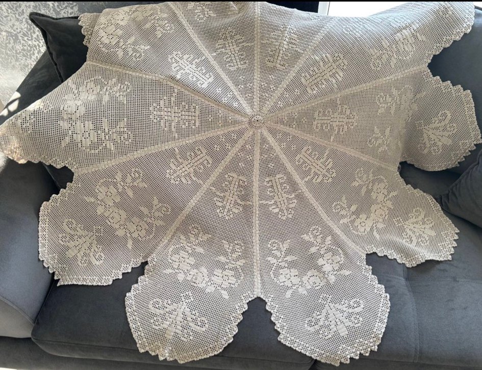 İnce iplikle işlenmiş, zarif desenlere ve fırfırlı kenarlara sahip geleneksel el yapımı bej rengi dantel masa örtüsü. Kalın iple muntazam örülmüş, tok, ağır bir örtü. Ölçüsü son fotoğrafta.