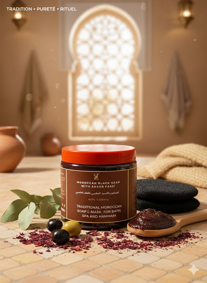 Geleneksel Fas siyah sabunu ve akker fasel içeren, spa ve hamam ritüelleri için uygun peeling sabunu.