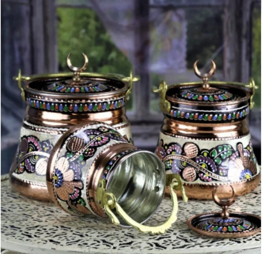 Renkli çiçek desenleri ve hilal kulplarıyla süslü geleneksel bakır saklama kavanozları. Her kavanozda çıkarılabilir kapak ve taşıma kulpu bulunur.