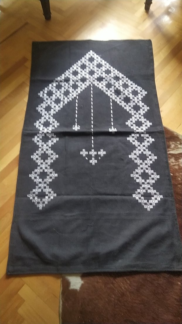 Geleneksel beyaz işlemeli geometrik desenler ve sarkıt motifleri bulunan siyah el yapımı seccade