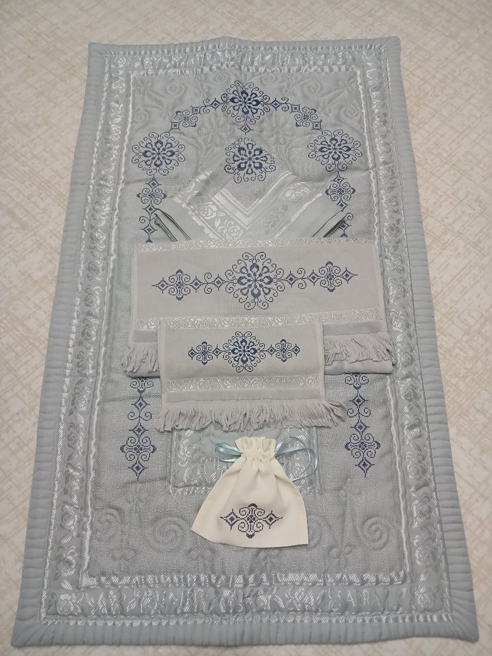 Gri renkte, lacivert işlemeli 5 li seccade seti