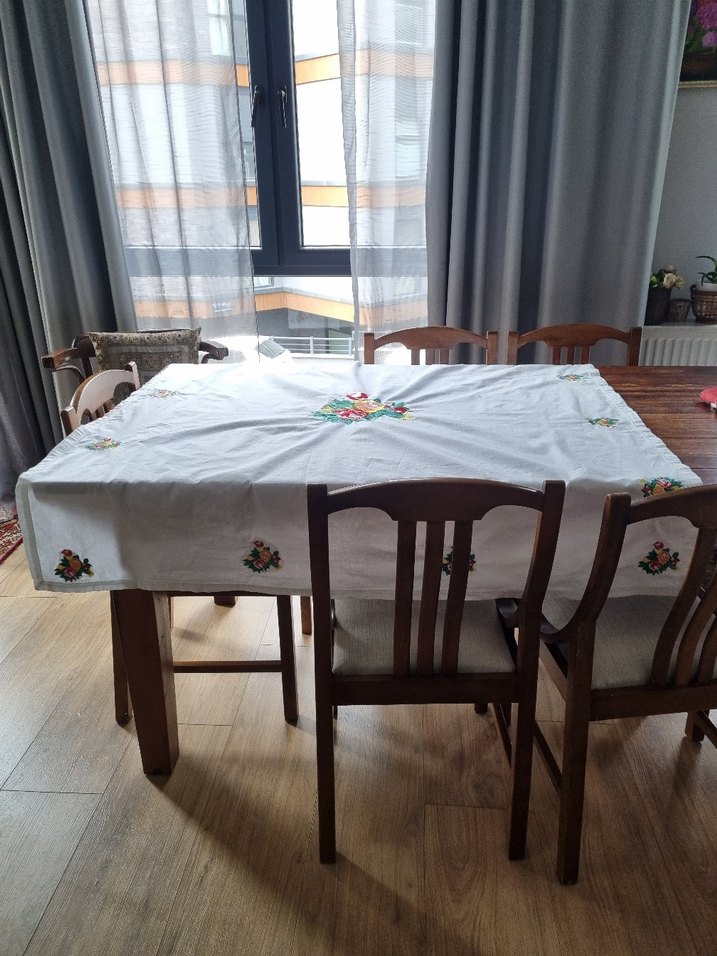 Yumuşak kumaştan yapılmış beyaz masa örtüsü, nakışlı çiçek desenleriyle geleneksel bir dokunuş sağlar.